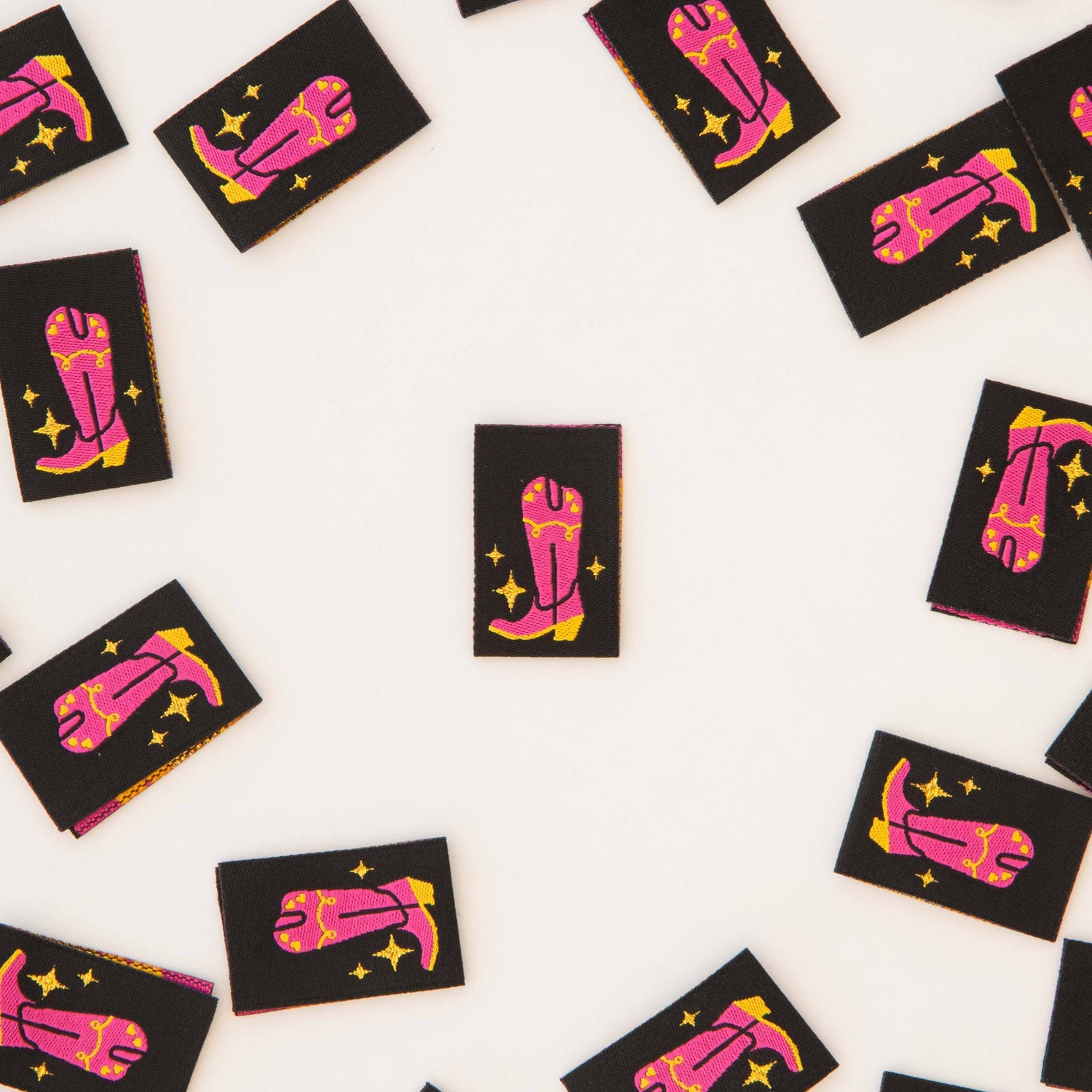 Add a unique western flair to your sewing projects with these Cowboy Boot Woven Labels. Featuring a vibrant combination of pink, yellow, and metallic gold, these double-sided labels are perfect for apparel, quilts, and bags. Get creative and let your inner cowgirl shine!