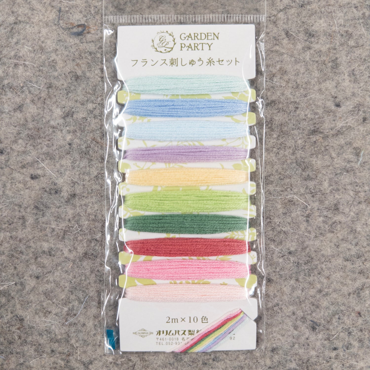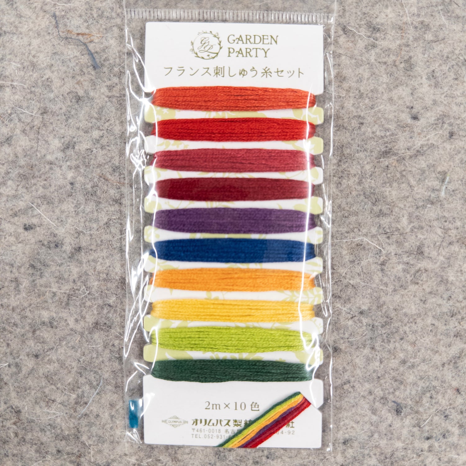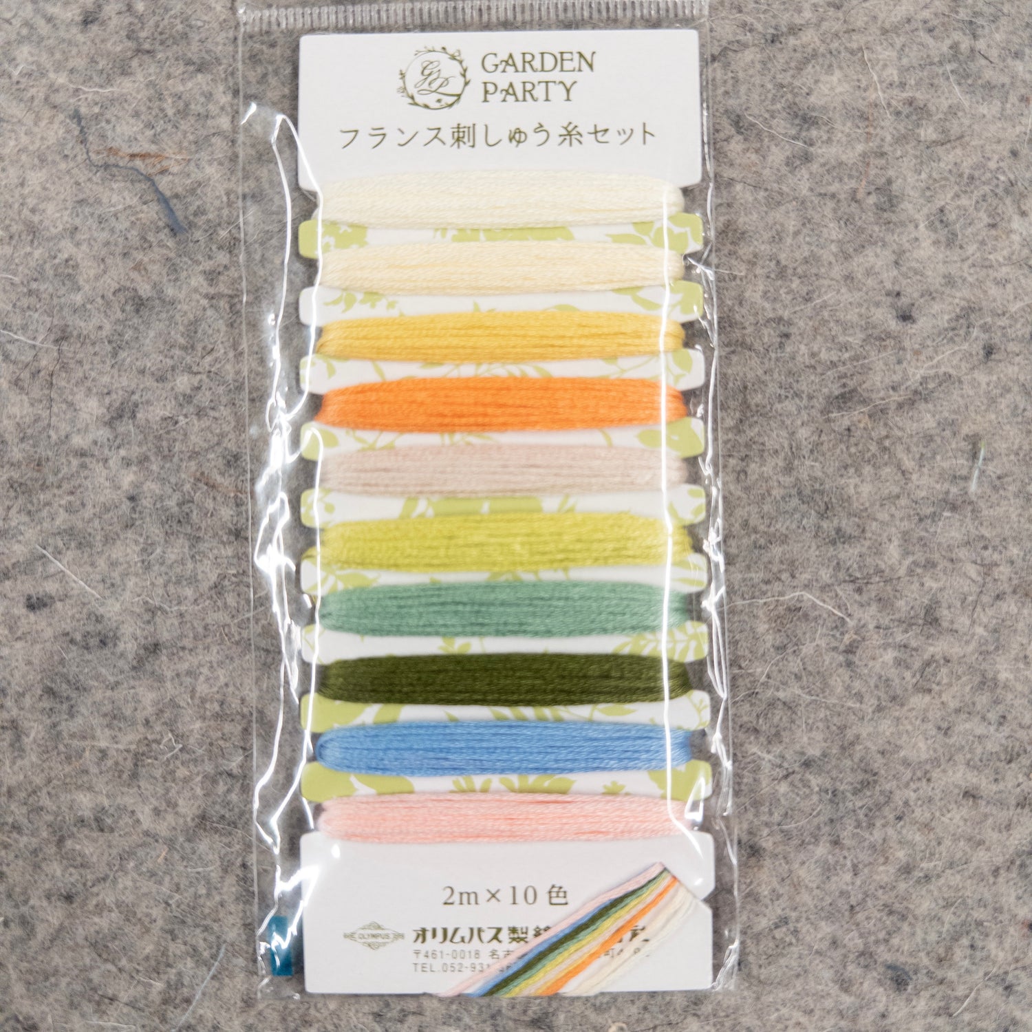 Includes 10 colors of Garden Party themed, assorted Olympus Cotton Embroidery floss No 25. Each color is 2-1/5 yards and separately wound on the same cardboard spool which is 2-1/2in x 5-1/2in. These embroidery threads are glossy and beautiful, and colors do not fade.