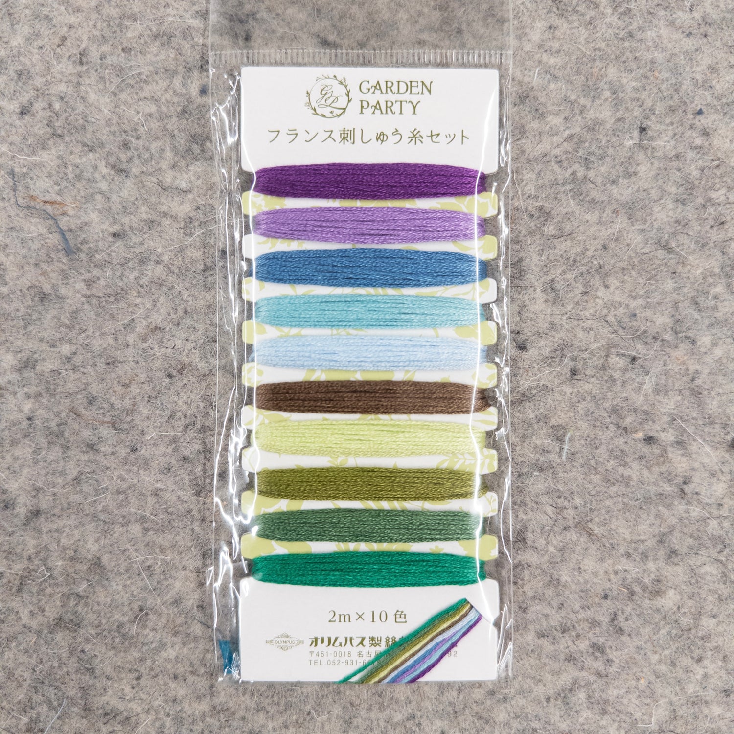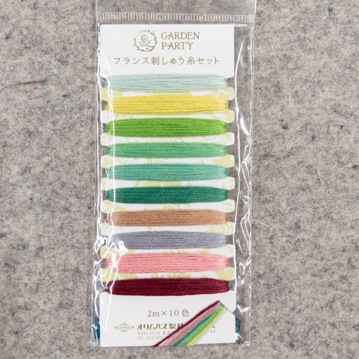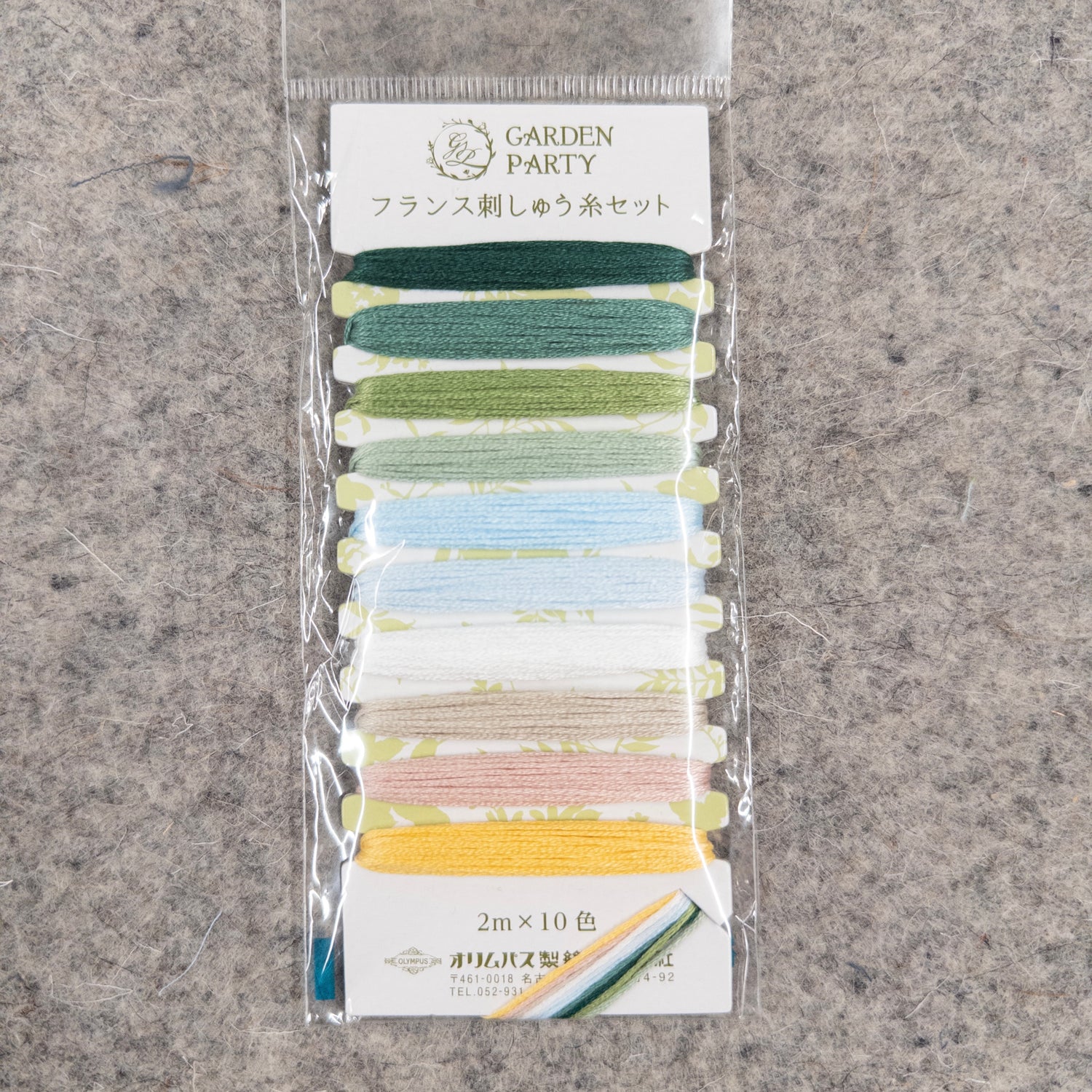 Includes 10 colors of Garden Party themed, assorted Olympus Cotton Embroidery floss No 25. Each color is 2-1/5 yards and separately wound on the same cardboard spool which is 2-1/2in x 5-1/2in. These embroidery threads are glossy and beautiful, and colors do not fade.