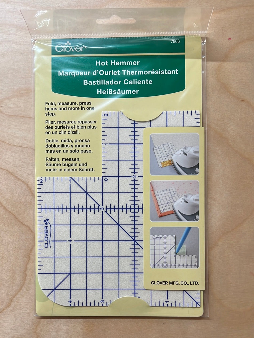 Description: Use this tool to measure, fold and press hems or miters.  It is heat resistant so you can press press directly on the ruler with a dry or steam iron.  Unique non-slip surface holds fabric in place for precise results.