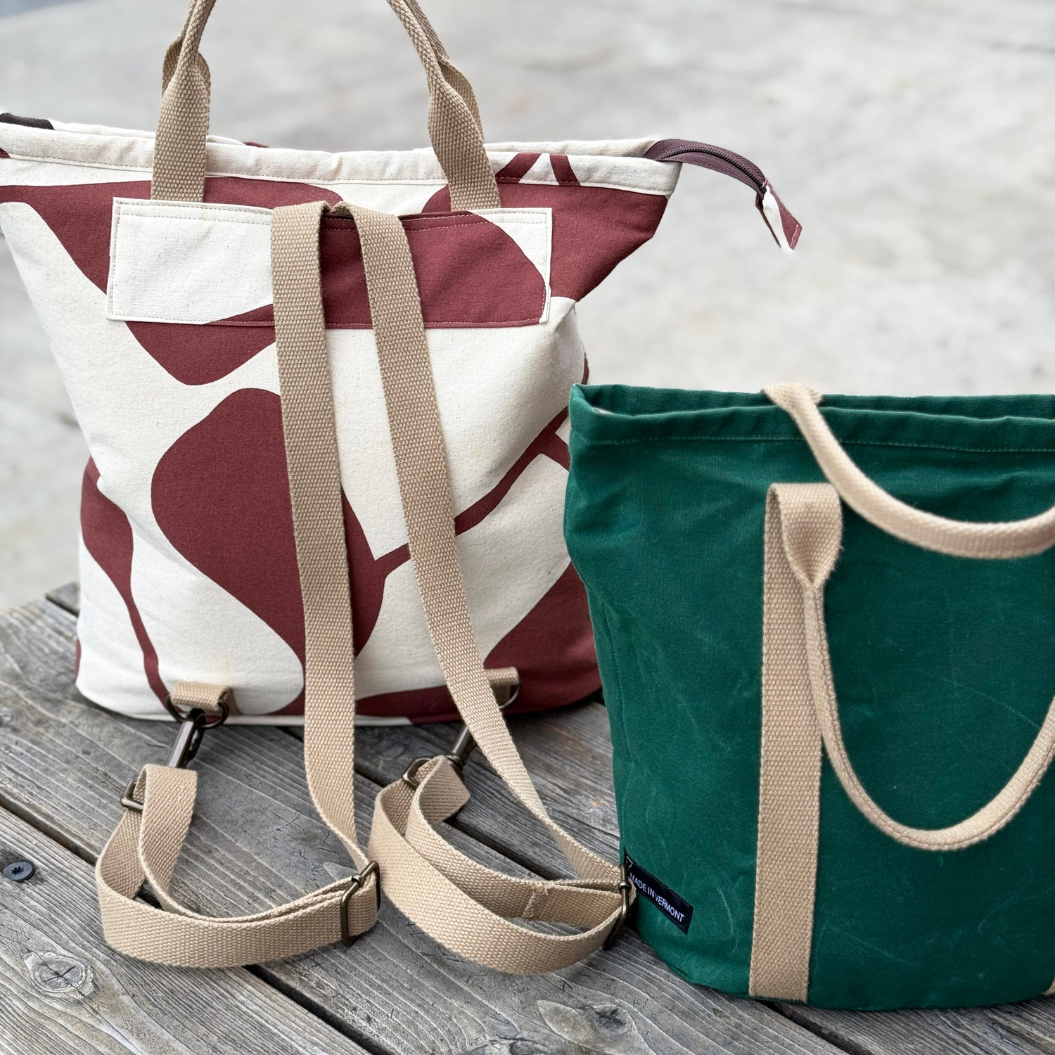 Welcome to Learn to Sew the Buckthron Tote or Backpack class! These are must have bags for everyday use, and a great project for advanced beginners. Both feature a zip top and oval base for plenty of interior space. An outer pocket is great for small goods with larger pockets inside.