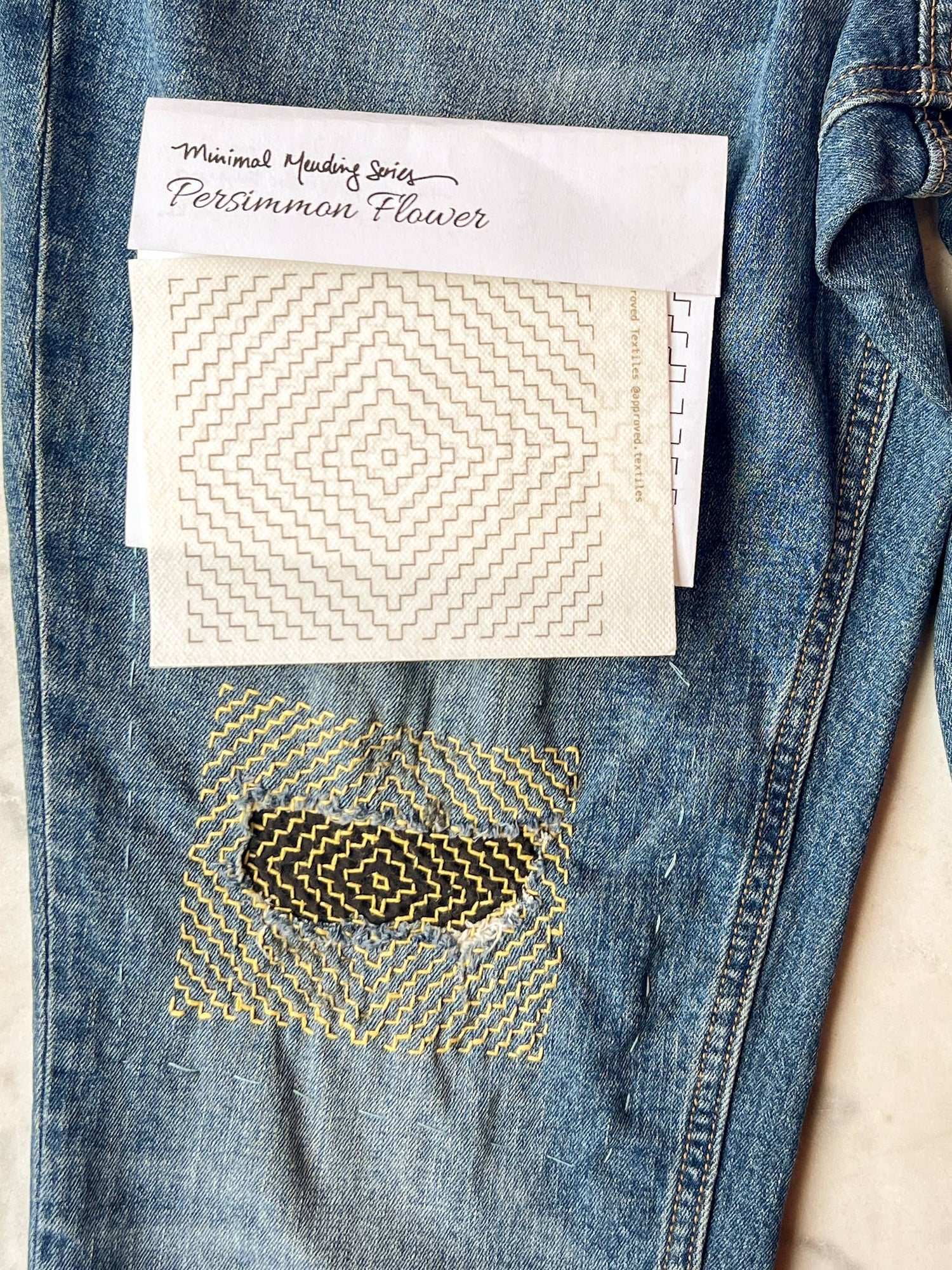 Delicate yet grounded, this design is inspired by the shape of persimmon calyxes—those quiet, star-like forms left behind after harvest. “Persimmon Flowers” invites you to mend with care, intention, and a touch of natural poetry.